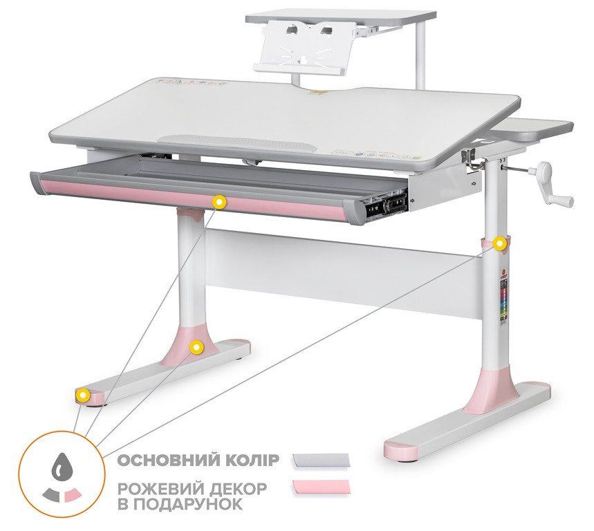 Стільниця змінює кут нахилу до 60 градусів за допомогою газліфта, що дозволяє підібрати положення для читання, письма, малювання.