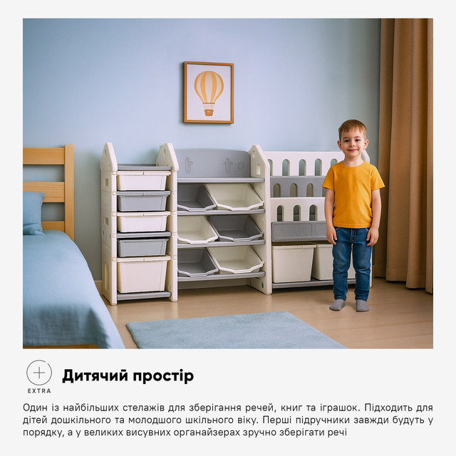 Один із найбільших стелажів для зберігання речей, книг та іграшок. Підходить для дітей дошкільного та молодшого шкільного віку. Перші підручники завжди будуть у порядку, а у великих висувних органайзерах зручно зберігати речі
